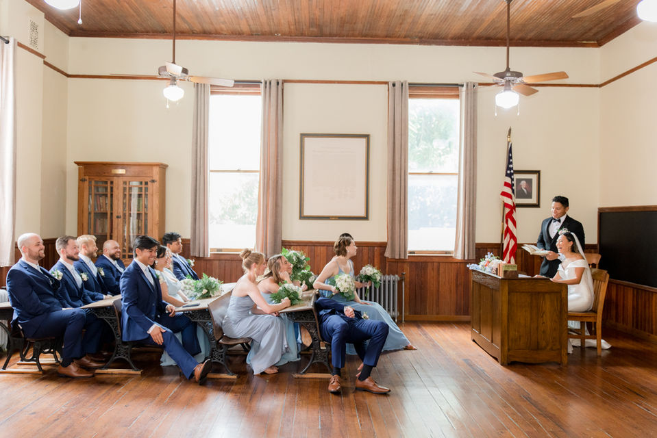 Talk about indoor wedding goals! This stunning celebration brought soft blues and playful pops of peach to our Historic Stage. The Couple shared their emotional vows surrounded by friends and family, then partied on a classic black and white dance floor. From the crisp white aisle to the classic wedding cake, every detail was timeless and the fun lasted all night long. Images compliments of